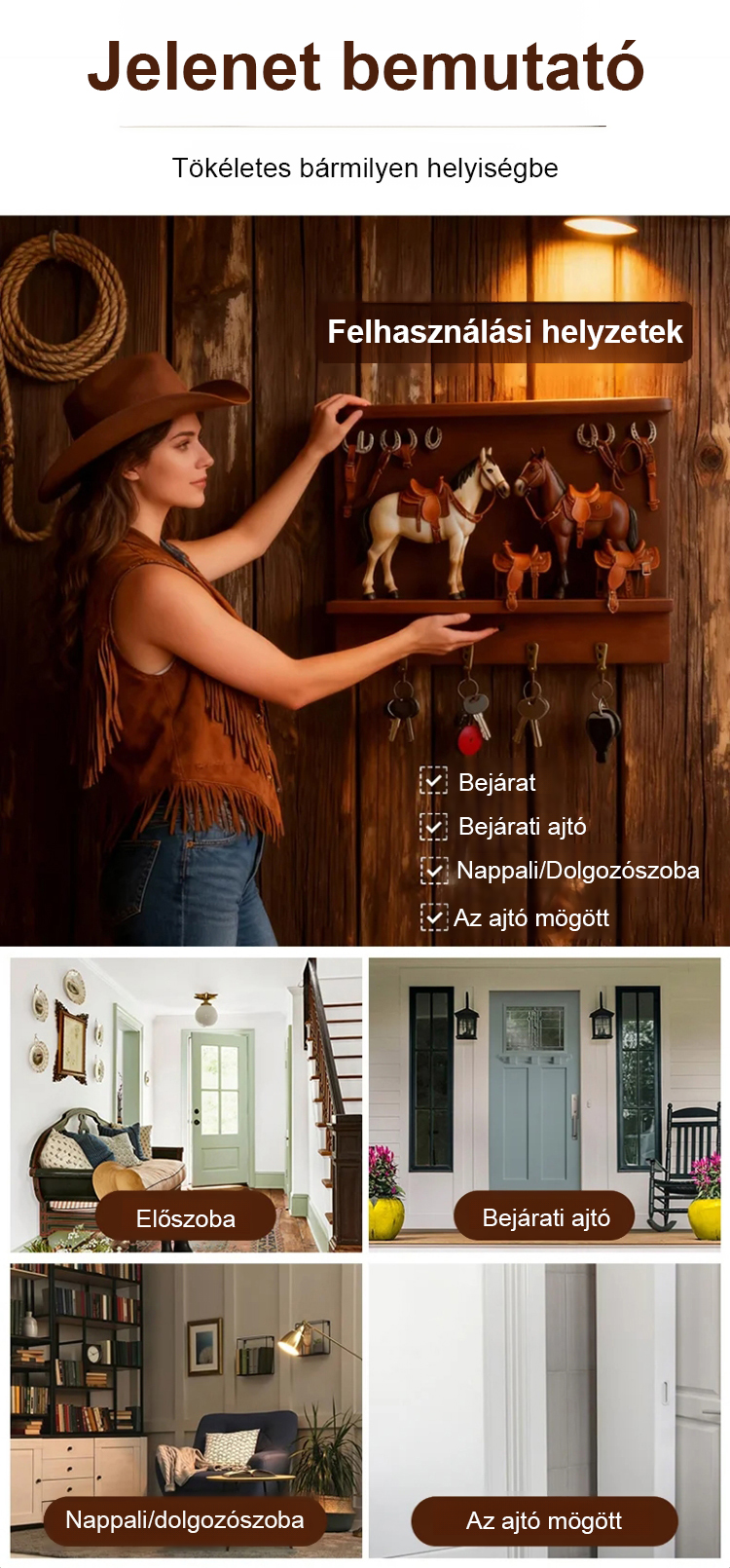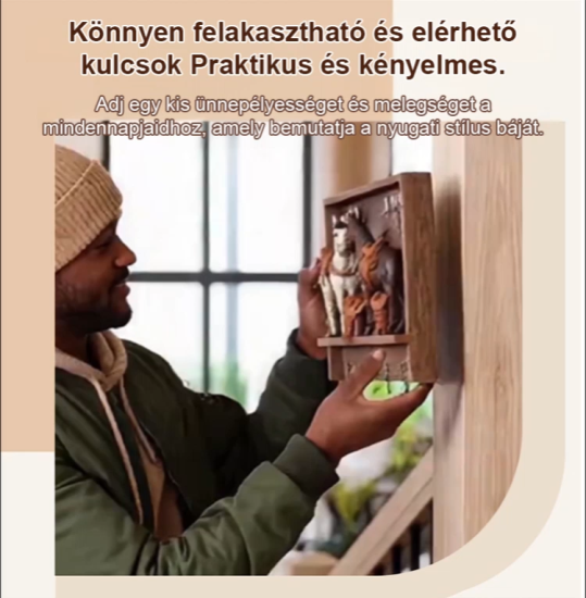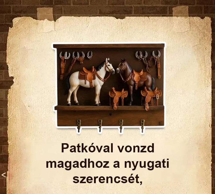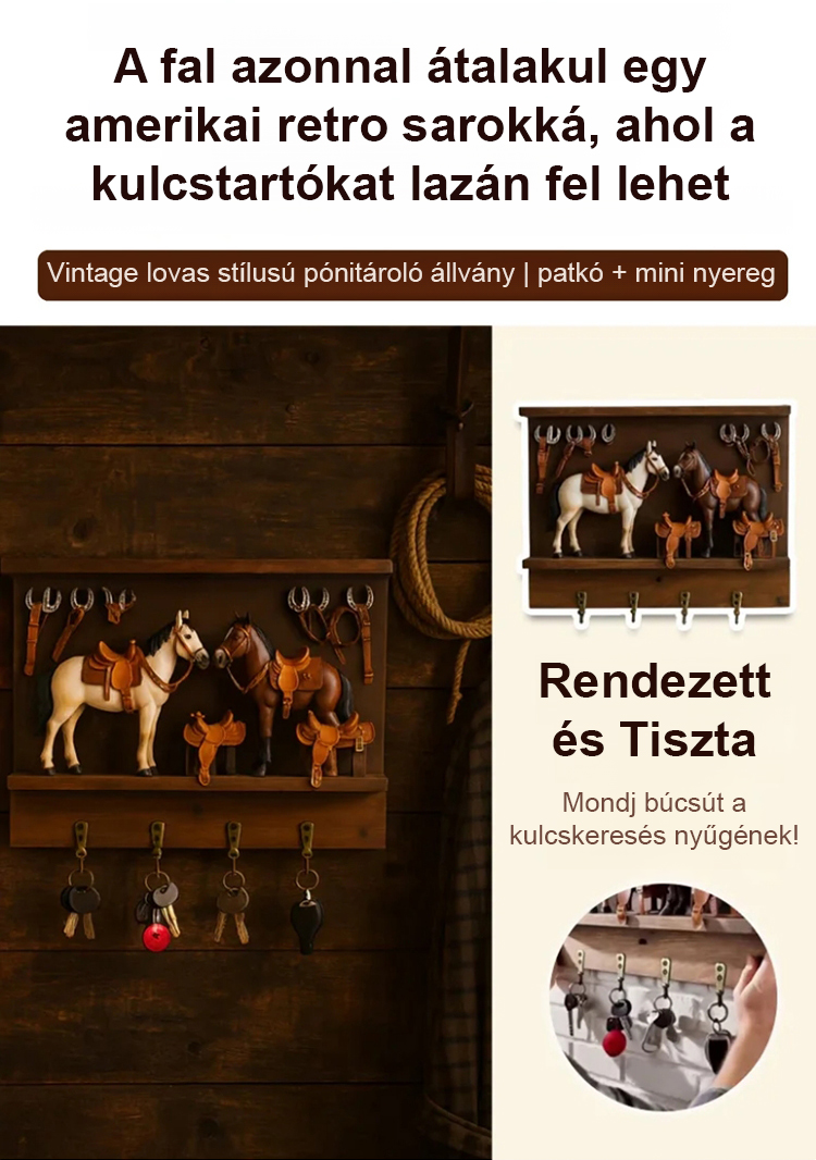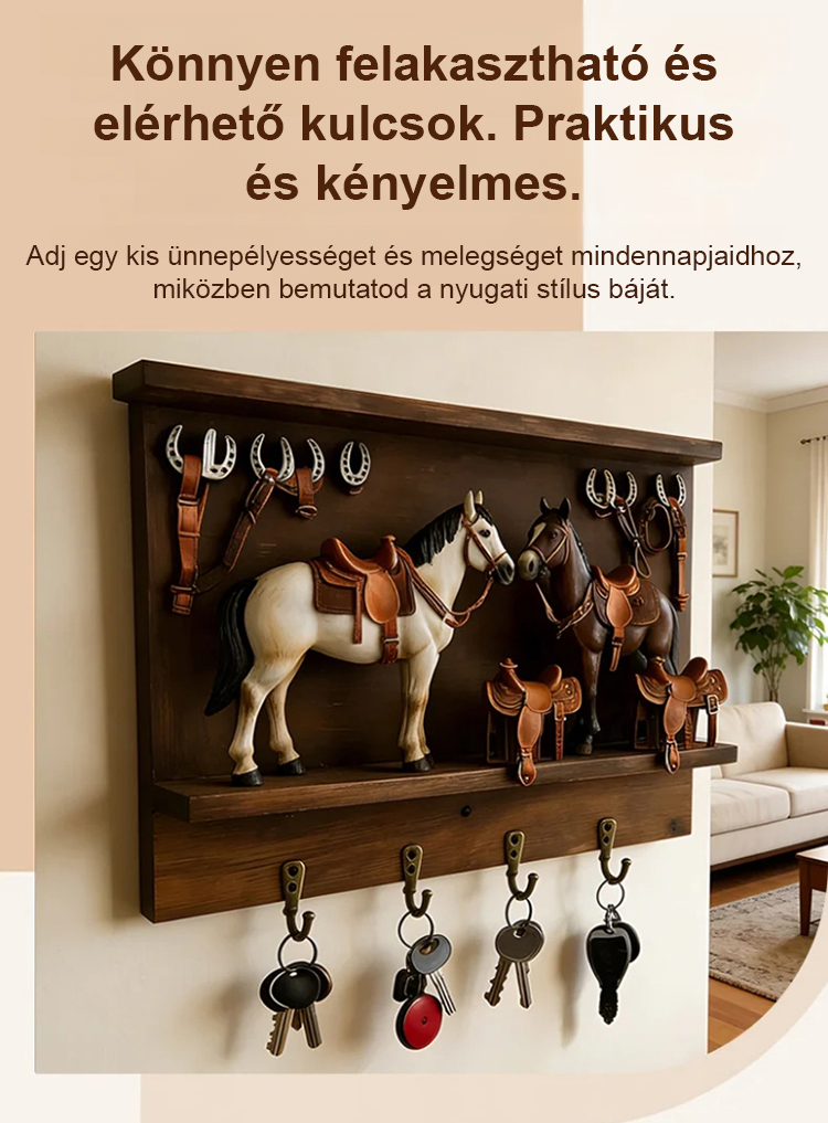 Ennek a kulcstartónak a tervezése a klasszikus nyugati farmélet ihlette, élethü lovakkal és részletes mini nyergekkel. Nemcsak egy háztartási tárgy, hanem egy olyan darab is, amely karaktert adhat az elöszobádnak, folyosódnak vagy nappalidnak